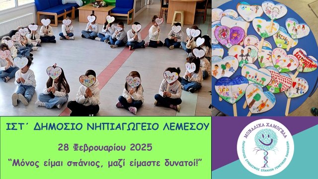 28/02/2025: Παγκόσμια Μέρα Σπάνιων Γενετικών Παθήσεων. Τα παιδάκια και οι εκπαιδευτικοί, φορώντας άσπρη φανέλα και jean παντελόνι (ως συμβολισμό των γονιδίων-genes) συμμετέχουν στη σχολική καμπάνια "Wear that you care-Μοναδικά Χαμόγελα".